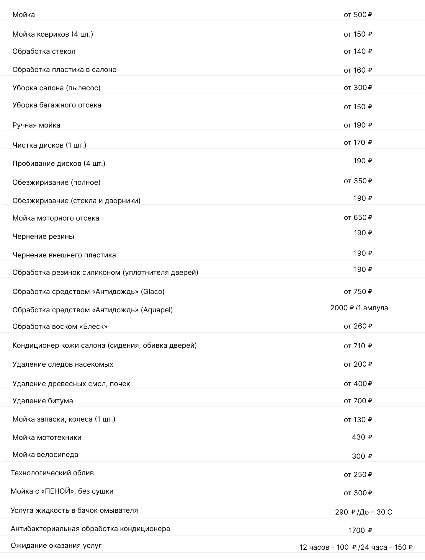 (мойка «люкс», обезжиривание, воск, чистка дисков, сухая химчистка сидений, чернение резины и наружного пластика)